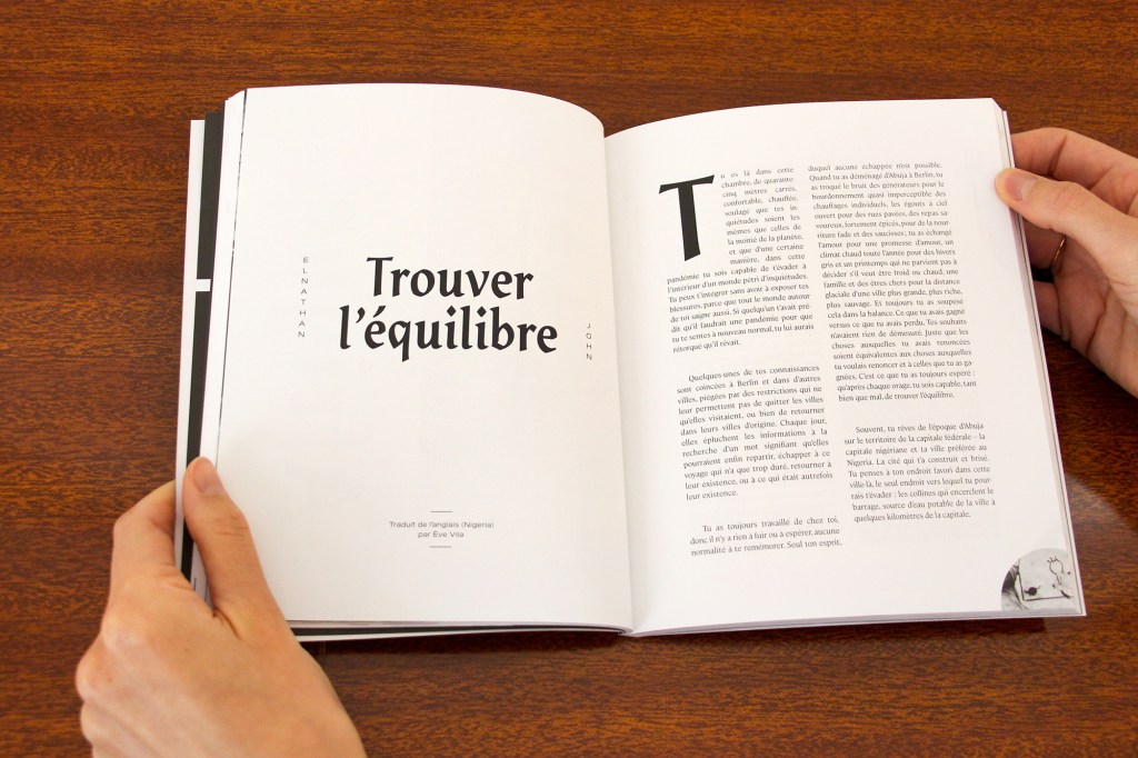 Au final, nous ne nous doutions pas que le thème résonnerait si fort avec le contexte, nous l’avions choisi il y a longtemps. Quand nous avons sollicité Elnathan John, le ton intime de son texte, le point de vue sur la crise sanitaire nous ont beaucoup plu. Trouver l’équilibre est intéressant à plus d’un titre car il présente un individu vivant à l’étranger, dans un monde qui nous devient étranger à tous, et de fait le narrateur se sent plus à sa place dans ce monde. Par sa forme, le texte crée un décalage, car il a tout d’un essai. Le fait de le traiter comme une fiction, de l’intégrer dans un recueil de nouvelles, déjoue le réel dans une certaine mesure.
